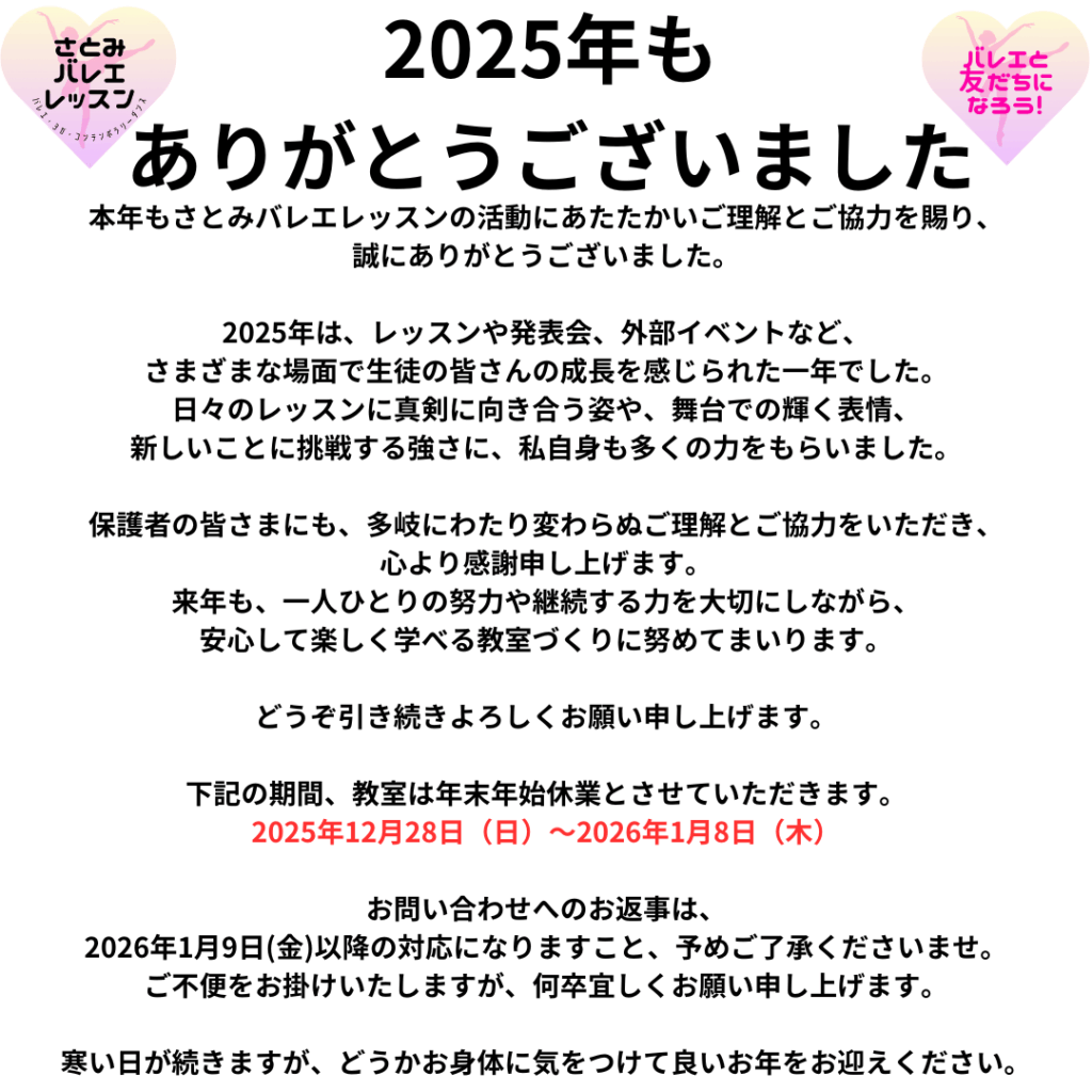 【年末のご挨拶】2025年もありがとうございました! 2025年12月15日 最終更新日時 : 2025年12月1日 satomi_ballet アイコンリンク アイコンリンク アイコンリンク アイコンリンク ブログ一覧→
